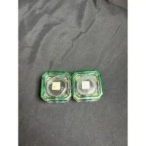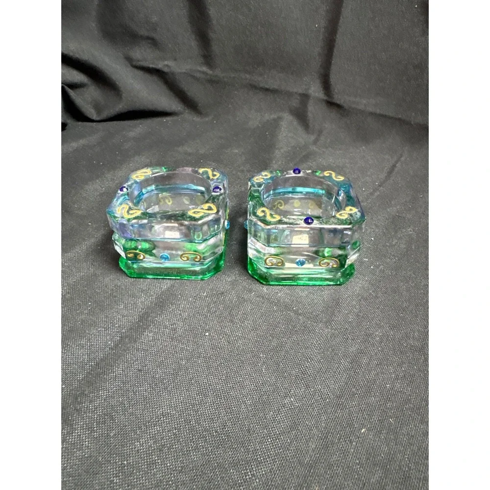 Vintage PartyLite candle holders feature a striking two-tone design with vibrant green bases transitioning into clear blue glass tops. These square, heavy glass votive holders are adorned with hand-painted gold scrolls and small blue rhinestone accents, creating a whimsical yet elegant look. Perfect for adding a pop of jewel-toned color to a mantle, dining table, or vanity, these pieces reflect light beautifully when paired with tea lights or small votives.