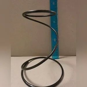 Crackle glass cup suspended from a spiral metal stand. Simple black metal frame. Clear crackle glass adds textured light effect. Stylish tabletop accent.