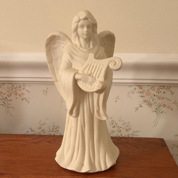 Vintage PartyLite bisque porcelain angel candle holder playing a lyre. Can be displayed with or without a taper candle.