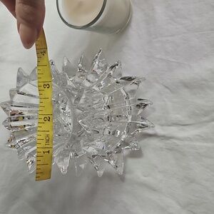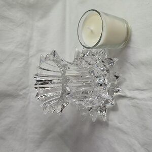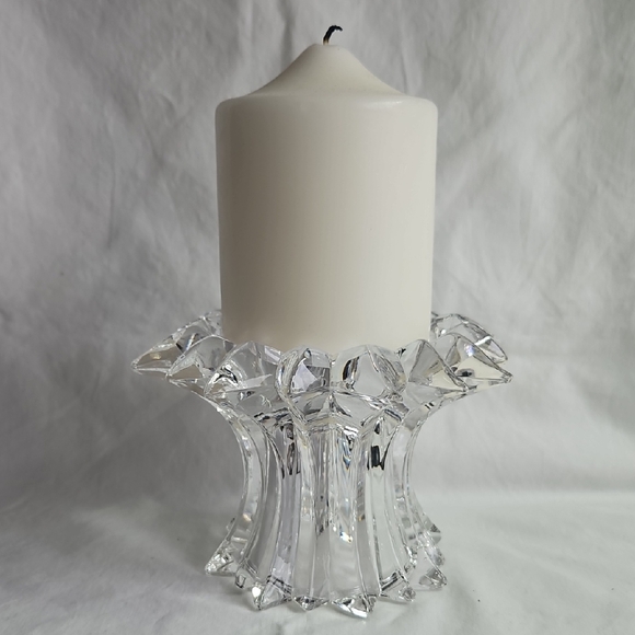 Enhance your home decor with this elegant crystal candle holder. one side holds a pillar candle, the other a votive or t-light. Perfect for adding a touch of sophistication to any room.
