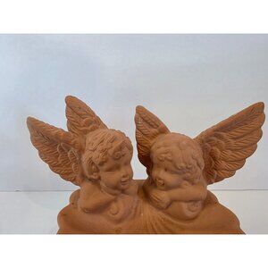 This charming cherubic terracotta planter doubles as a candle holder, offering a whimsical touch to gardens or interiors. Featuring two angels with detailed wings, it presents a versatile design for either displaying small plants or candles.
