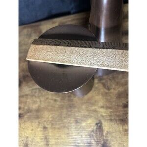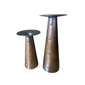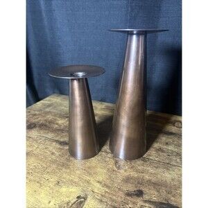 The Partylite Copper Metal Taper candle Stick Holders with a faux rivets design are a set of two medium-sized candle holders made of faux copper/bronze metal. The candle holders have an asymmetrical conical shape with a retro rustic theme, perfect for all occasions in any room. The metallic brown finish adds a touch of elegance, making them a stylish addition to any collection or decor. Made in India in the 1990s, these candle holders are suitable for taper candles and are a unique and eye-catching piece for adults' home.