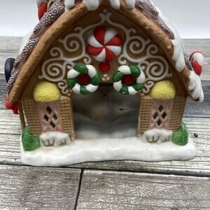 The Partylite Gingerbread Village Holiday House Tea Light is a festive candle holder crafted of ceramic, standing at 7 inches tall and 6 inches long. This retired collectible features a charming multicolor design and is perfect for adding a seasonal touch to your Christmas decor. The village-themed piece adds a cozy and whimsical ambiance to your home during the holiday season. E