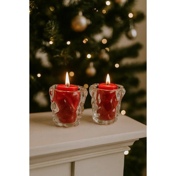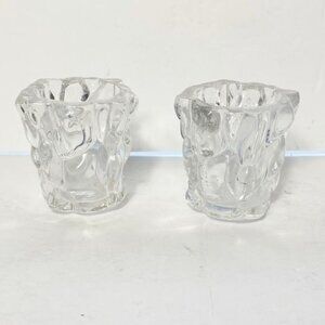 Elegant clear glass votive holders with a sculpted glacier-inspired design, suitable for enhancing home decor or as part of a collectible series.