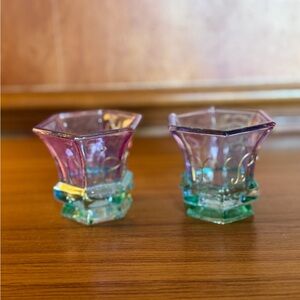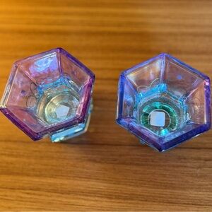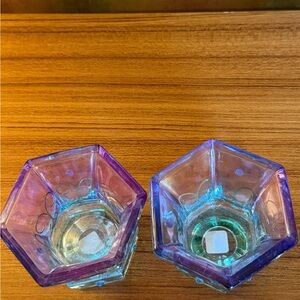They are made of glass with an iridescent, multicolor finish, primarily purple and green.