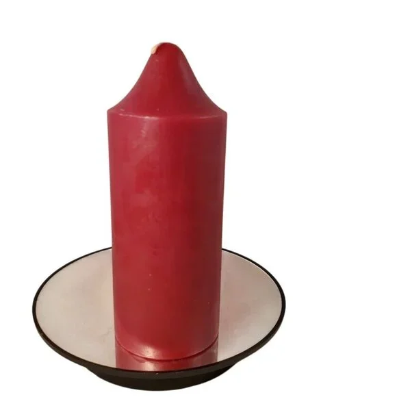 Classic solid wax pillar with single centered wick and original box included. Deep burgundy plum tone complements traditional, cottage, and holiday decor. Substantial size ideal for lanterns, hurricane holders, or mantel styling. Unused condition with visible wax bloom and surface scuffs from storage. Box shows wax staining and wear consistent with age.