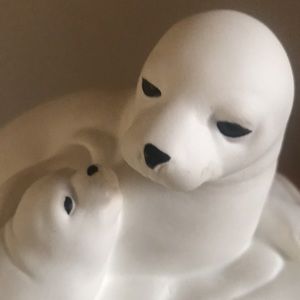 A beautiful piece from the Partylite Nature’s Wonders Collection is this arctic Harp seal with pup. Wonderfully crafted in stark white with black details for the seal’s eyes and nose, this is new in box. A place for a tea lite candle , this ceramic piece measures 7” long , 5” wide and 3” high at highest point. A great gift for the nature lover🦭🦭