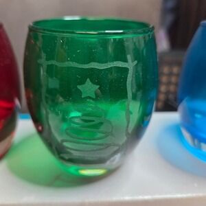 Illuminate your holiday spirit with this enchanting set of three Partylite votive candle holders. Each glass vessel radiates festive cheer, with a charming snowman etched into the deep red holder, a whimsical Christmas tree gracing the vibrant green one, and twinkling stars adorning the serene blue holder. Imagine the warm glow they cast, creating a cozy and magical ambiance for intimate gatherings or quiet evenings by the fire. Perfect for adding a touch of seasonal magic to your mantelpiece, dining table, or as a delightful accent in any room, these holders invite you to celebrate the joy of the season.