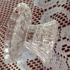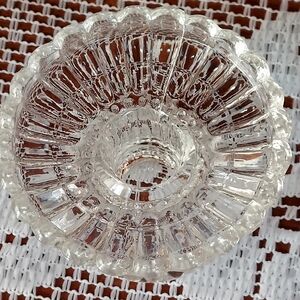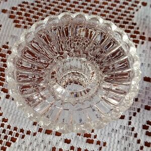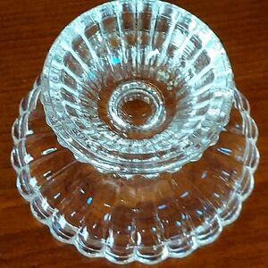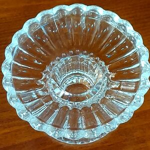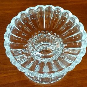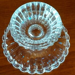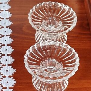 Set of 2 vintage, clear pressed glass, taper candle holders by Partylite. Fluted design and scalloped edges. 1990's. Pedestal base. 2.25" high, 3.5" at rim. Excellent condition. No chips or cracks. Non-smoking household.