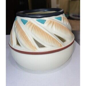 The Partylite Southwestern Feather Ceramic Votive Tealight Candle Holder is a beautifully crafted decorative piece that adds a touch of Native American charm to any space. The multicolor feather pattern on the matte ceramic finish creates a unique Southwestern style that is perfect for collectors or those looking to enhance their home decor. Utilizing the traditional tealight candle holder design, this piece brings both illumination and a touch of cultural flair to any room.