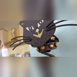 Add a whimsical touch to your decor with this rare PartyLite Felix Le Chat candle holder. This charming metal statue features a spiral body with a cute white fish bone design where the tummy would be. The collar is adorned with orange stones, and the cat's face has adorable metal whiskers, adding to its unique character.