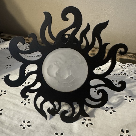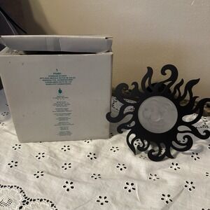 The Partylite Sunbeam Sconce Tea Light Candle Holder P0481 is a sleek and stylish decorative piece made of black metal with a frosted glass shade. Its design features a sun motif, making it suitable for all occasions and any room in the house. The sconce is 6 inches in length and comes boxed, making it a perfect collectible or gift for someone who appreciates a touch of elegance in their home decor. Perfect for adding a warm and inviting ambiance to any space.