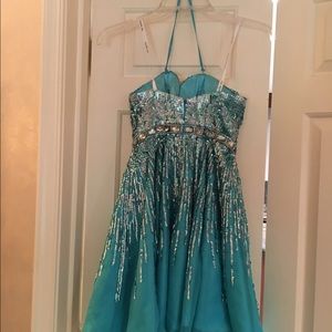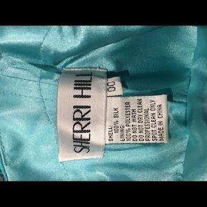 Beautiful aqua colored strapless party dress. Sequined bodice and swingy full skirt. Designed by Sherri Hill. Worn only once. Great condition!