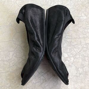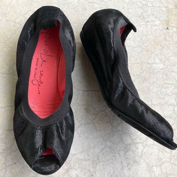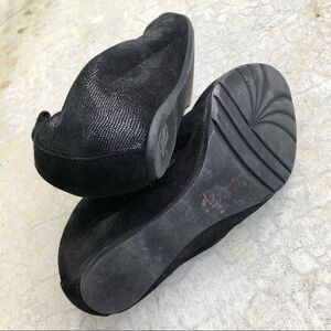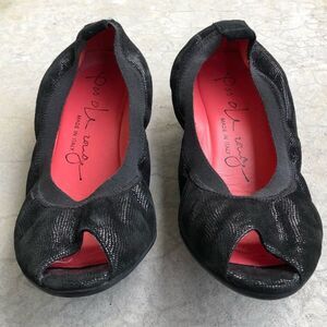 Pas De Rouge Shoes Peep Toe Wedges black nubuck suede leather. Slip on style. Elastic trim on the edges. 1.5” wedge heels.