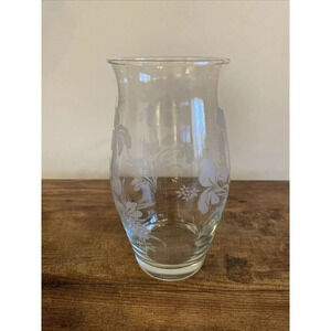 Pasabahce Made In Turkey Art Glass Clear Etched White Floral Vase 8”H 3.75”D.