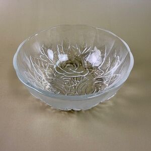 Add a touch of timeless charm to your serveware with this crystal-clear bowl from the Livia collection by Pasari. Featuring an embossed rose and leaf pattern, this petite pressed glass bowl is perfect for small servings, desserts, or simply as a lovely decorative accent. The textured frosted glass catches light beautifully and adds vintage elegance to any table setting.