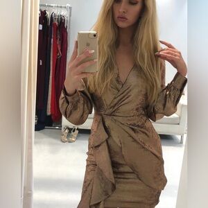 Unapologetically bold, the Blaze Dress is a sure head turner this season. High shine metallic bronze fabric is semi fitted in cross over fashion across the bust and fixed at the waist while blouson sleeves are anchored with shirt cuff detail. A plunging V neckline is balanced with wrapped gathers across the hip spilling into a draped waterfall asymmetrical detail. Falling to the mid thigh and fully lined throughout.