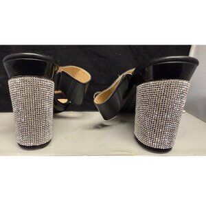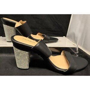 Pashion Footwear ORIGINAL DESIGN SLIDES. Gently used. Very comfortable and the versatility of styles by changing the heels makes this one of the best sandals for travel. This interchangeable heel set is Pashion’s ORIGINAL STYLE. Therefore, the current heels sold on the Pashion Footwear Website WILL NOT WORK WITH THIS SANDAL. Included are 3 sets of Stiletto heels and 4 sets of Block heels. Also, can be worn as flats with the flat caps installed. Rhinestone heels do have some wear but not too noticeable when worn.