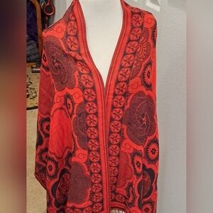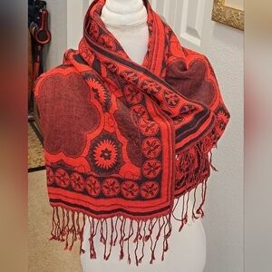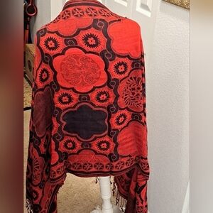multi patterned, 27"×73" plus fringe, there are 2 pulls (see pics) missing 1 fringe