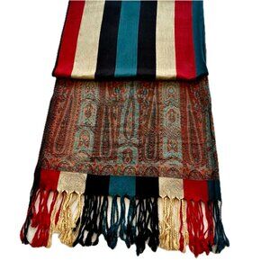 Pashmina Scarf Bold Stripes & Pattern Turquoise Red Navy Tan Gold Fringe EUC