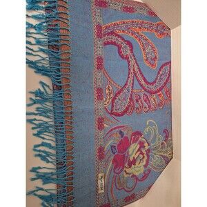 This Pashmina scarf wrap shawl in pink and blue with a paisley print and fringe accents is perfect for the winter season. Made from knit fabric and measuring 60 inches in length and 27 inches in width, it is both stylish and functional. The vintage piece features a bohemian, hippie vibe that adds a touch of nature and festival flair, making it a versatile accessory for various occasions. Hand wash only to preserve its quality, this scarf is a must-have for any fashion-forward woman. Like new condition.