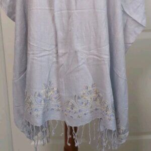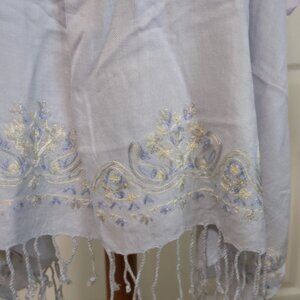 Pretty Pashmina fringed light blue scarf/shawl with blue and white stitching along the border. 80 in long x 19 in wide. 100% rayon, hand wash. NWT