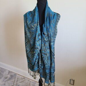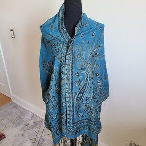 Pashmina Shawl Scarf Cashmere Silk Teal Blue Turquoise Black Paisley Wrap 68x26