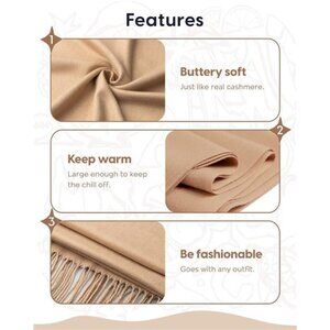 【Softness】This scarf is large, warm, lightweight and soft, feels like cashmere. 80" long (74" + 3" tassels on each side), 27" wide, and weighs 9.1 oz. Still soft after many washes.