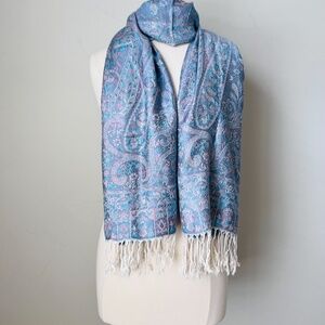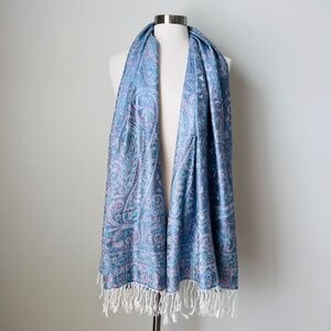 Rare and unique 70% Pashmina, 30% Silk scarf. Elegant blue paisley scarf with fringe detailing. Perfect for adding a touch of style. Excellent like new condition.