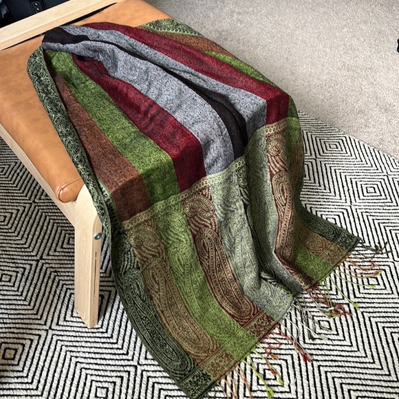 Very pretty paisley and striped 70% Pashmina and 30% Silk wrap. Great for travel. Large enough to be a light blanket or wrap. No tears or stains. Comes from smoke free/pet free home.