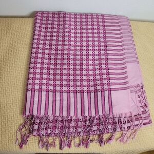 pashmina pink geometric scarf with fringe detail. has a few snags