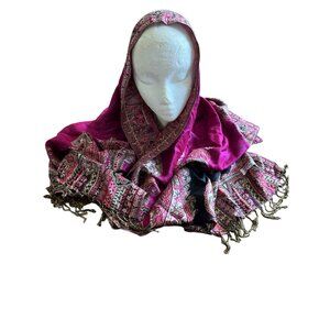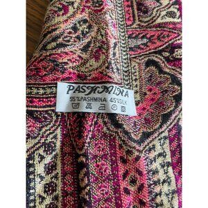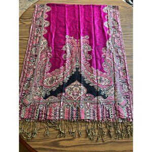 Pashmina pink tan black paisley blanket scarf with fringe 26”x78”. Really good pre-owned condition.