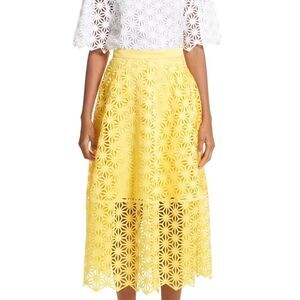 Geometric laser cutouts heighten the modern European sophistication of a sunny, double-layered A-line skirt cut with a high waist and flirty scalloped hem.