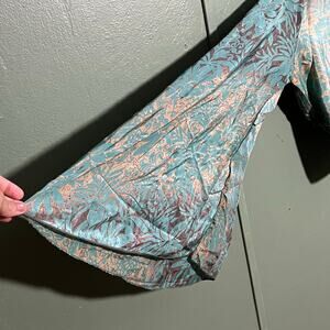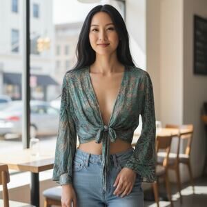 This stunning vintage Passage to India wrap crop top captures the essence of 70s boho chic with its mesmerizing floral paisley print in dreamy sage green and dusty rose tones. The luxurious fabric flows beautifully with dramatic bell sleeves that create movement and elegance. The flattering wrap design ties at the waist for a customizable fit while the cropped length pairs perfectly with high-waisted jeans or flowing skirts. This authentic vintage piece features quality construction and timeless bohemian style that's impossible to replicate. The intricate Indian-inspired pattern showcases delicate botanical motifs that catch the light beautifully. Perfect for festival season, date nights, or adding vintage flair to any outfit. This rare find embodies the free-spirited aesthetic of the disco era while remaining effortlessly wearable today. A true collector's piece that brings instant boho glamour to your wardrobe.