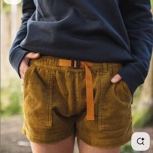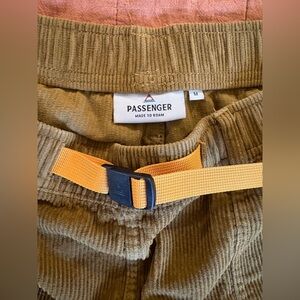 Stylish Passenger brand brown corduroy shorts perfect for casual outings. Features a comfortable fit, an elastic waist, and an orange belt. Made from a sustainable Recycled cotton cord.