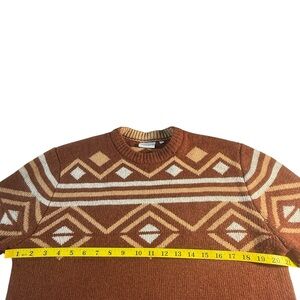 Nice and thick — this sweater is great for the cooler months of winter. Perfect for a Christmas cabin or mountain vacation. Has a nice tan / camel geometric retro print. Acrylic nylon / wool blend.