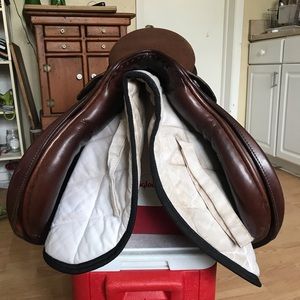 Passier & Sohn Hanover, 17” seat, wide tree, super deep seat, wide tree. The leather is starting to show some age, but is in overall good condition. One of the stirrup leather holder’s stitching is a little loose. There is a minor blemish on the top of the cantle.