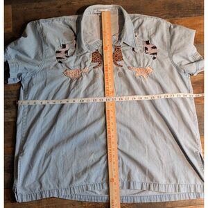 Purr-fect for any cat lover, this adorable Passion embroidered denim shirt is ready to steal your heart! The moment you see its playful light blue denim adorned with a delightful collection of embroidered cats in various poses and colors, you'll feel an immediate pull to its undeniable charm. Crafted from soft, breathable 100% cotton, this short-sleeve button-up shirt offers supreme comfort for all-day wear. Each embroidered cat is unique and adds a whimsical touch, making this top a true conversation starter. Imagine wearing this with leggings or jeans for a comfortable day out, attending a cat show, or simply enjoying its quirky appeal for daily errands. You deserve clothing that reflects your passions and brings a smile to your face. This isn't just a shirt; it's a feeling of cozy comfort, an expression of your love for felines, and an irresistible addition to your wardrobe!