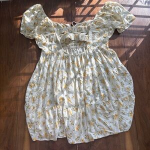 Adorable off-shoulder dress with floral design. Soft fabric for casual wear. Cream and yellow hues add charm.