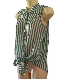 Green and white striped chiffon blouse has button front , collar, sleeveless and front bottom tie