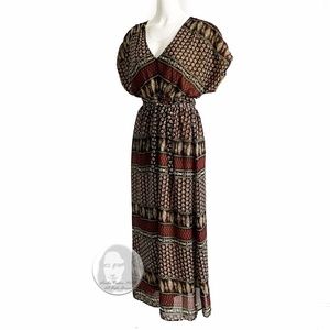 Preowned maxi dress by Passport, a division of Ms Bubbles Inc. Made from brown poly fabric, it features a colorful boho print with paisley and florals! Slips over the head and is lined, with tie-wraps at the waist and angel sleeves! A great little dress that's easy to style and wear!