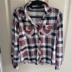 Chic plaid shirt with button-down style. Features pink and white tones. Perfect for casual wear.
