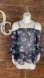 Passport Sheer Babydoll Blouse. Cold Shoulder. Adjustable Straps. Floral Design. Ruffle Trim. Peplum Hemline. Navy Color. White, Red and Teal Accent Colors.