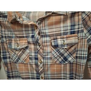 Passport Small Peach Navy Plaid Flannel Long Sleeve Preppy Chic Button Up Shirt