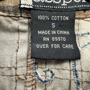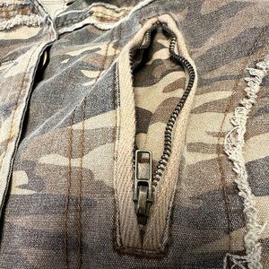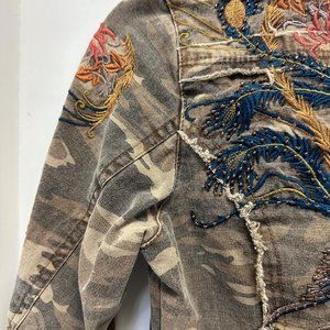 Passport Women's distressed embroidered camo, military replica, size small, preowned, good condition. Measurements are in photos; jacket has zippered front pockets. It might have missing beads too many to see correctly if some are missing.