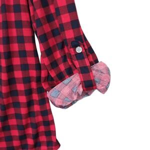 -Features: White pearl snaps, double front snap pockets, long sleeves with snap cuffs & optional roll tab, collared neckline, red & navy buffalo plaid pattern, thin flannel-like material