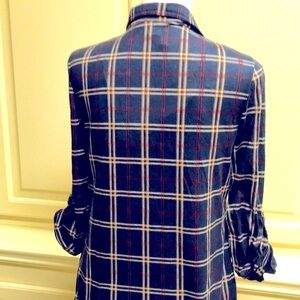 From Buckle! Plaid shirt with tabs for rolling up long sleeves. Navy red ecru and white plaid. Double buttoned breast pockets. Excellent condition. No known flaws.