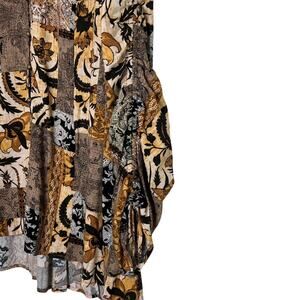 Passport by Susan Graver Womens Blouse XL Brown Gold Patchwork Print Ruched Sleeves Rayon Autumn