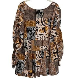 Susan Graver blouse, patchwork boho blouse, ruched sleeve top, relaxed fit tunic, lightweight rayon blouse, brown gold floral blouse, long sleeve boho top, plus size casual blouse, arsty print top, flowy everyday blouse, pumpkin patch, autumn blouse, fall fashion