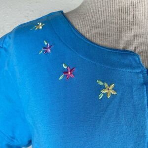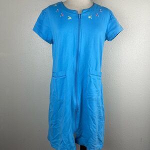 Super fun bright blue shower or pool robe by Passports featuring a floral stitched design at the collar. It measures 20 inches armpit to armpit laying flat and 36 inches in length from shoulder to hem.